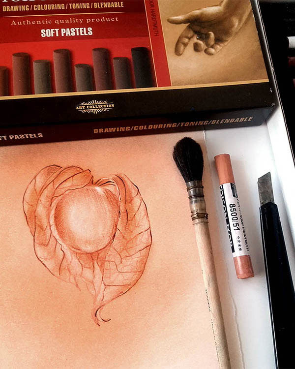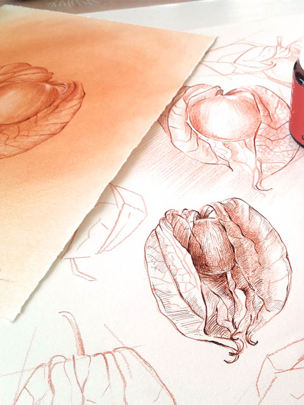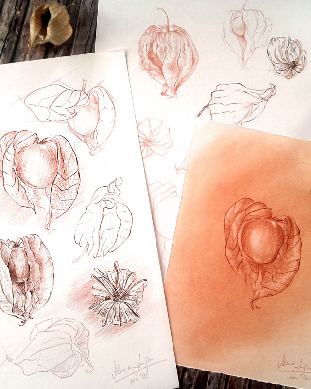 I uploaded a new class on my Patreon on how to draw a Physalis fruit with fruit with sanguine on red prepared paper.