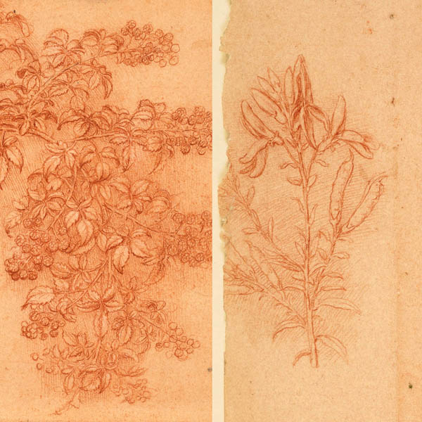 The method was largely used by the old renaissance masters and most of the botanical masterpieces of Leonardo are made by this red-on-red technique. Sanguine, a soft stone with a high content of iron oxide, was traditionally employed to draw organic subjects and it has been highly valued due to the possibility of varying the line and of a fine rendering of shadows that gave the drawings elegance and refinement.