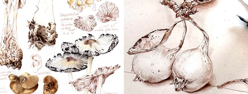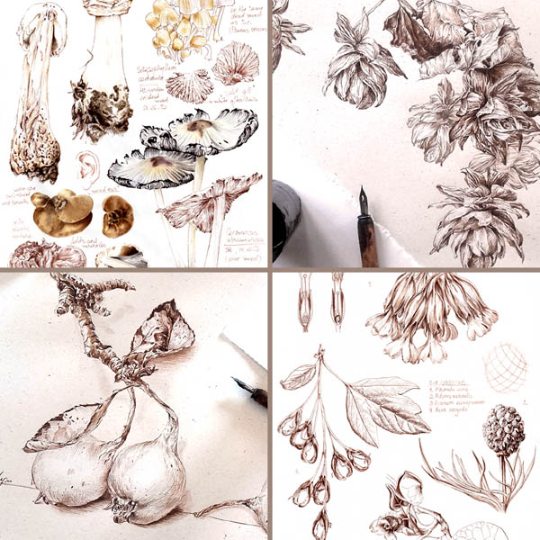 The botanical journal is more about satisfying my curiosity, discovering and learning about the botanical world, the passing of the seasons, being present. What can I see if I look at this seedpod with a magnifying glass or what will I discover if I cut this fruit in half? What if I count and measure these distances, what pattern will I identify? With every new subject, I also explore drawing various forms and textures, practice with different painting mediums, mainly watercolor, and I train the eye in imagining complex compositions.