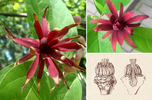 The flowers bloom at the end of short branchlets in May, are 5cm across, with numerous spirals of narrow and leathery tepals that open gradually as the flowers mature (we name tepals those parts of perianth that cannot easily be classified as either sepals or petals). Their color is often burgundy, with brown, burn tips. There are 5-30 yellow stamens, arranged in a spiral. The styles are long and slender, 5-35, each with 1 carpel.