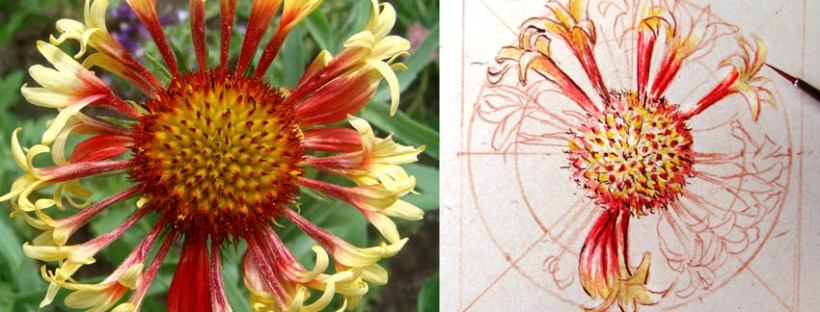 Part of the Asteraceae family, Gaillardia grandiflora has the same floral structure as Bellis perennis that I sketched a few days ago: a capitulum composed of hundreds of disc florets forming a circle in the middle, and ray florets surrounding this middle.