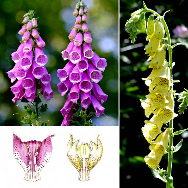The flowers of Digitalis purpurea, the purple foxglove, are tubular, pendent, arranged in a spiral around long spikes. Each flowers has 5 sepals, joined at the base, and 5 petals, joined in a tube, the lowest forming a lip as a landing area for pollinators. The lower petal also has markings to guide the pollinators (mainly bumblebees, large enough to touch the stamens and stigma sitting on the roof of the corolla tube) and long hairs to discourage small insects from entering the flower and feeding on the nectar found inside the narrow end of the tube.