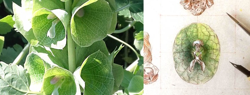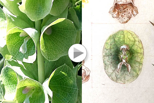 In today’s tutorial I draw I sketch with ink and watercolor the green calyx and the flower of this unusual looking plant.