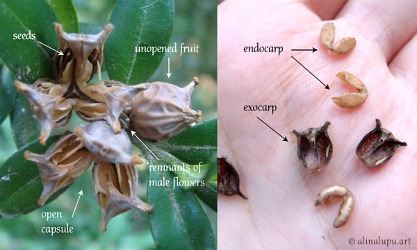 In our reference photo we can see an unopened fruit (which is the inflated ovary of fertilised female flower) and two open capsules. In each one of those little ochre-yellow chambers, there is a seed. The male flowers are reduced to a structure at the base of the fruit.