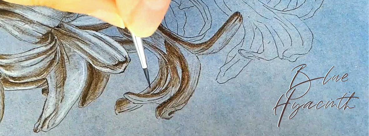 Watch me drawing a Hyacinth flower in old masters technique with brown ink and white highlights on tinted paper, inspired by the Leonardo`s drawings on blue prepared paper.