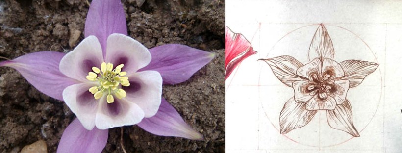 The blossoms of columbines may look complex but they conform to the model of 5-star flower forms. 5 lanceolate, petal-like sepals are interspersed with 5 petals standing upward, spurred or saccate at the base. In the spur, there is nectar on which bees, hawk moths and hummingbirds feed. Stamens are numerous (often more than 50) … Continue reading Daily Sketches – June 30 Flowers – 6. Aquilegia